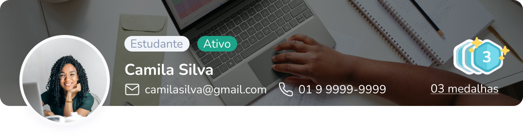 Você encontrará em um banner com informações sobre seu perfil como status, nome, e-mail, telefone e um pouco mais a direita, observe quantas medalhas você acumulou em sua jornada, conquistadas ao concluir módulos.