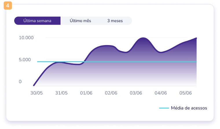 A quarta seção apresenta um gráfico de área que exibe a quantidade de acessos à plataforma por período (última semana, último mês ou últimos 3 meses).