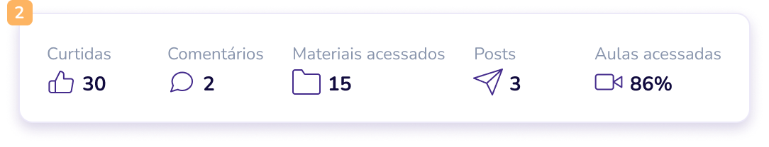 - Utilize as métricas de engajamento e colaboração para avaliar suas interações como curtidas, comentários, materiais/aulas acessadas e publicações feitas. Essas informações podem ajudar a identificar áreas que precisam de mais atenção e esforço.