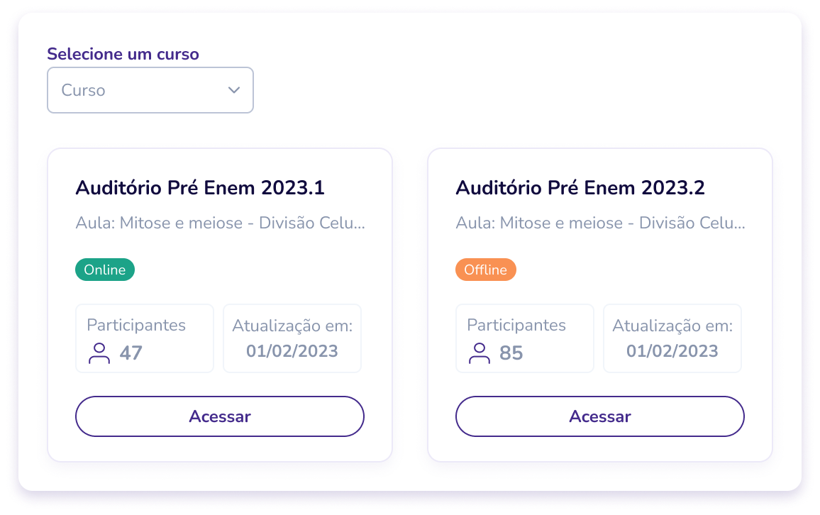 Logo abaixo, você poderá utilizar o filtro “Selecione um curso” para te ajudar a encontrar o auditório que procura. Se não selecionar nada, todos os auditórios disponíveis a você aparecerão na tela em formato de card. Basta escolher um e clicar no botão “Acessar”.