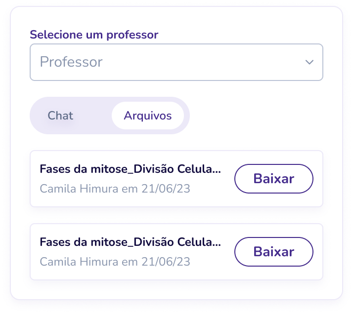 Sempre que o professor/monitor enviar arquivos durante a aula, eles aparecerão no chat central, onde você poderá acessá-los, mas também ficam disponíveis no botão lateral direito chamado “Arquivos”. Ao clicar, eles estarão organizados por data além disso para facilitar sua busca, você pode utilizar o filtro “Selecione um professor”.