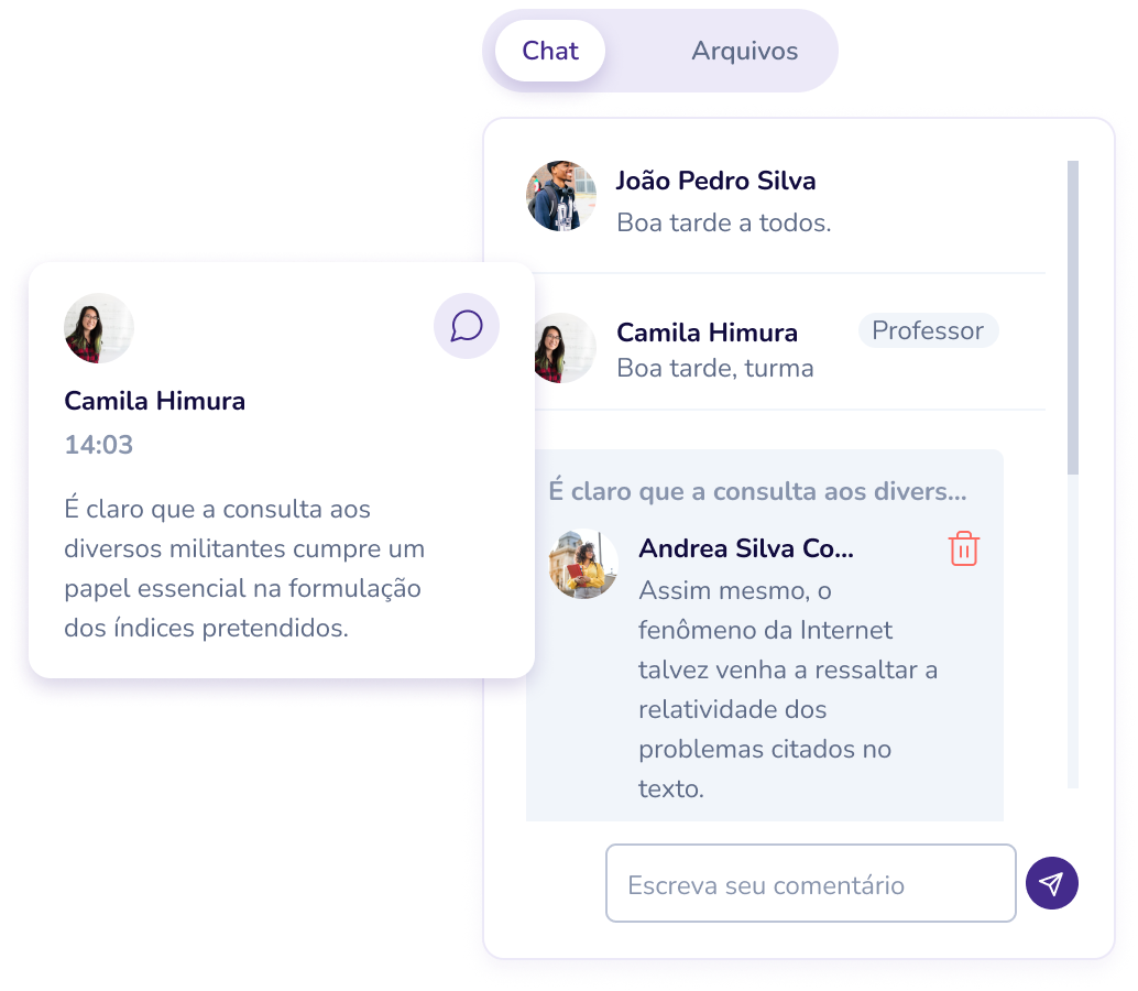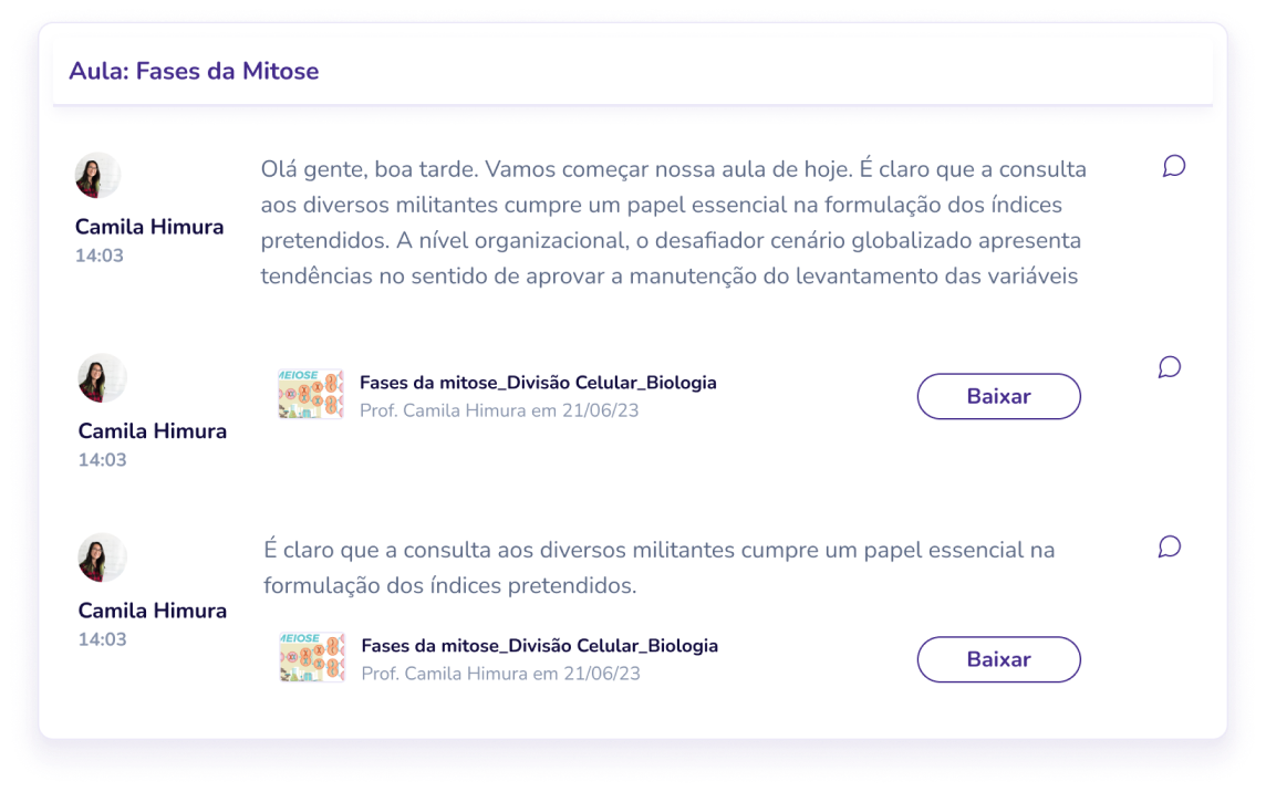 Você pode interagir durante a aula clicando no ícone de “balão” na parte central para responder a um comentário do professor/monitor ou pode escrever diretamente no campo de comentários, no chat localizado na lateral direita. Todos os comentários de alunos, inclusive os seus, sempre estarão organizados por data e hora como no chat central.