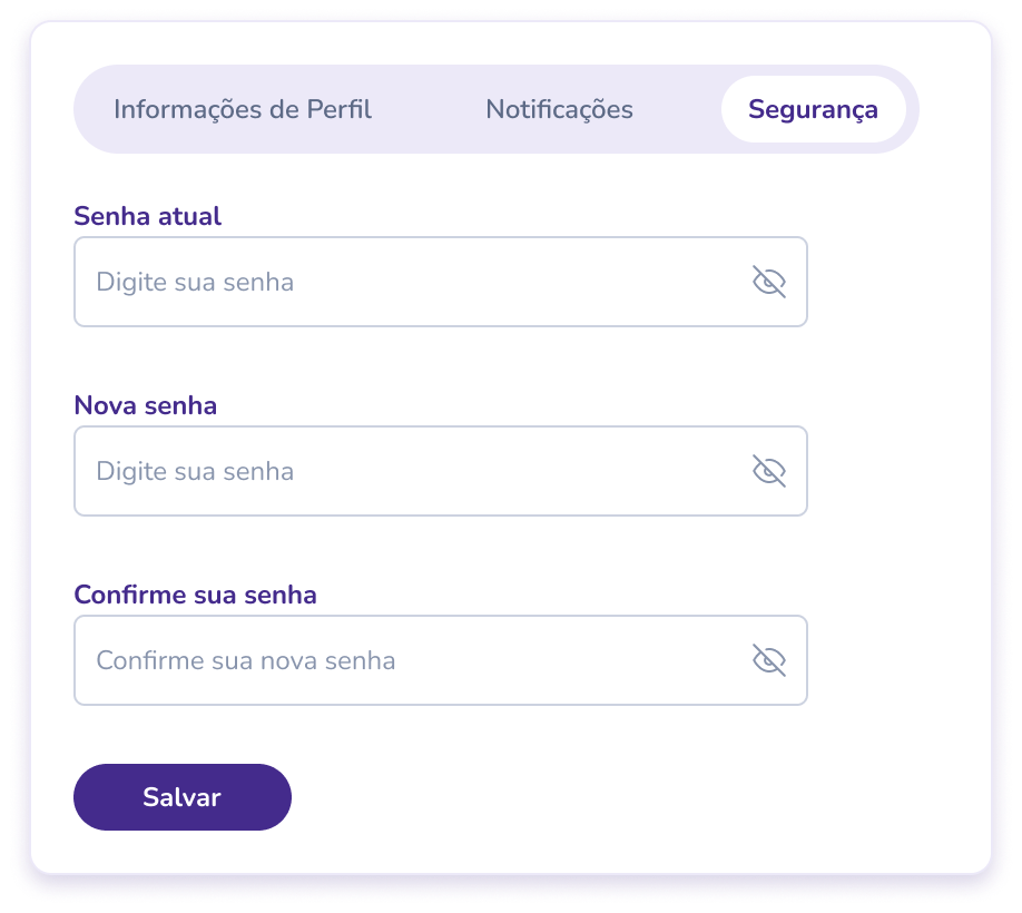 Na aba "Segurança", você pode alterar sua senha sempre que achar necessário. Proteja sua conta com uma senha forte. A segurança da sua conta é fundamental para proteger suas informações pessoais e garantir uma experiência segura na plataforma. Insira sua senha atual, digite a nova senha desejada, confirme-a e clique em "Salvar" para atualizar sua senha.