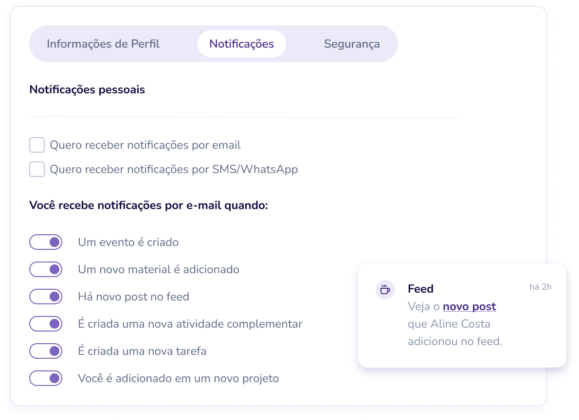 Fique por dentro de tudo o que acontece na plataforma. Na aba "Notificações", você tem controle total sobre como e quando deseja receber atualizações importantes. Você pode ligar ou desligar notificações individuais, garantindo que você receba apenas as informações mais relevantes para sua experiência de aprendizado. Selecione suas preferências de notificação por SMS/WhatsApp ou e-mail e escolha quais eventos você gostaria de ser notificado. As opções incluem: