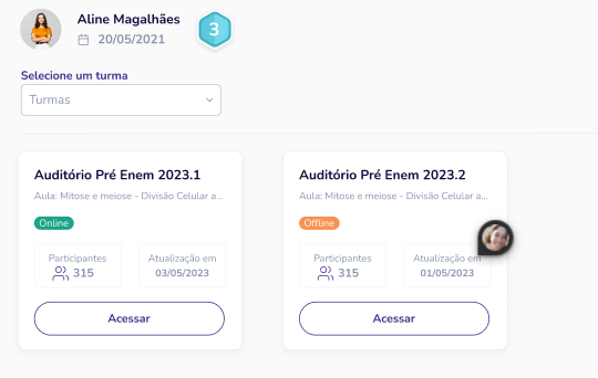 Para isso, vá no menu "Comunidade > Monitoria" e visualize as aulas disponíveis para sua turma. As aulas que estão acontecendo aparecem como online e as que já foram finalizadas, contém a informação offline no card.